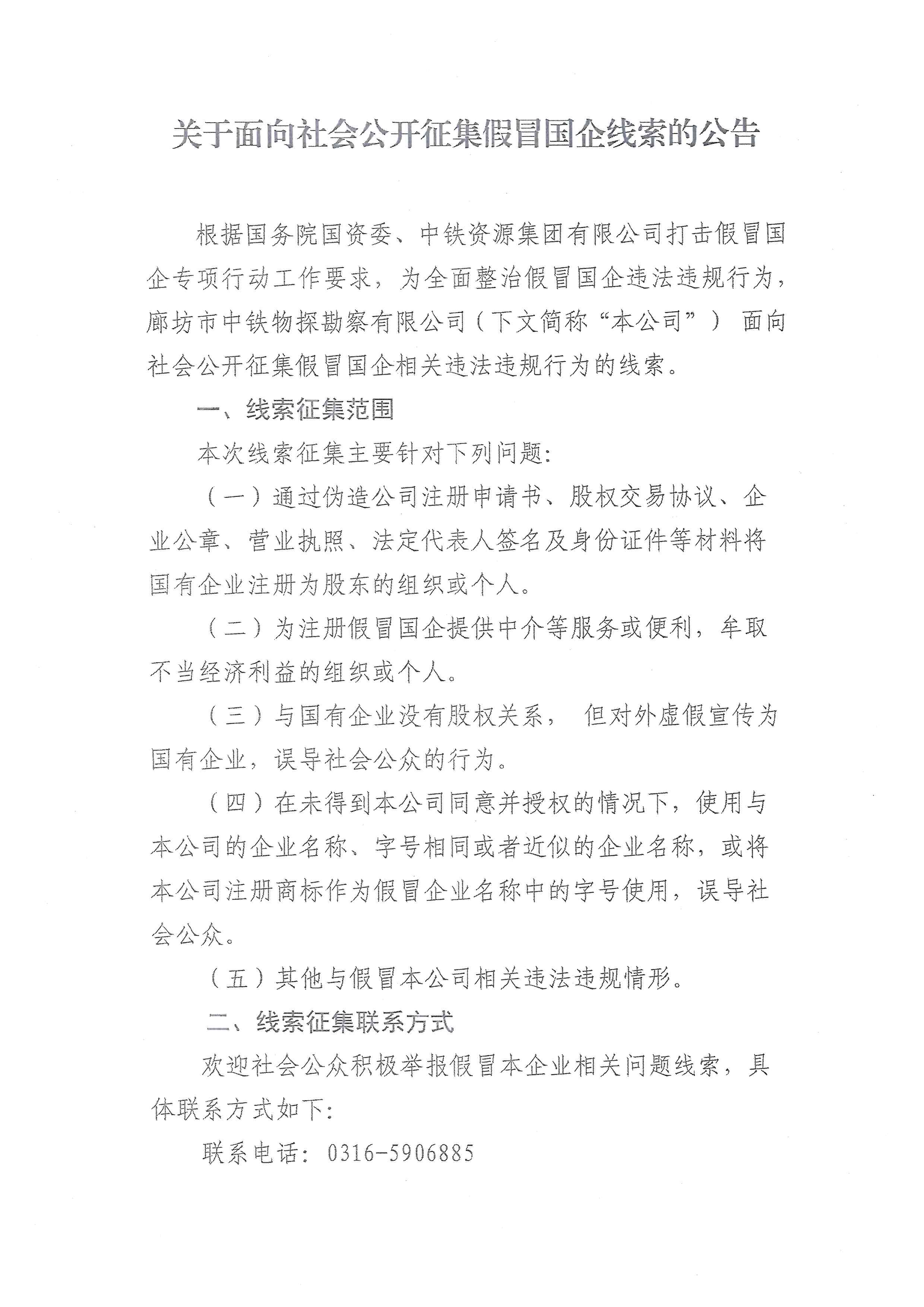 關(guān)于面向社會公開征集假冒國企線索的公告